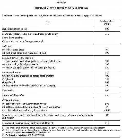 日前,歐盟正式實施了關于丙烯酰胺的法案COMMISSION REGULATION (EU) 2017/2158 。這個法案規定了包裝食品中允許含有丙烯酰胺的基準含量,并要求制造商密切檢查并降低產品中的丙烯酰胺含量,涉及范圍包括馬鈴薯制品、面包、麥片、咖啡和咖啡替代品、嬰兒食品等。