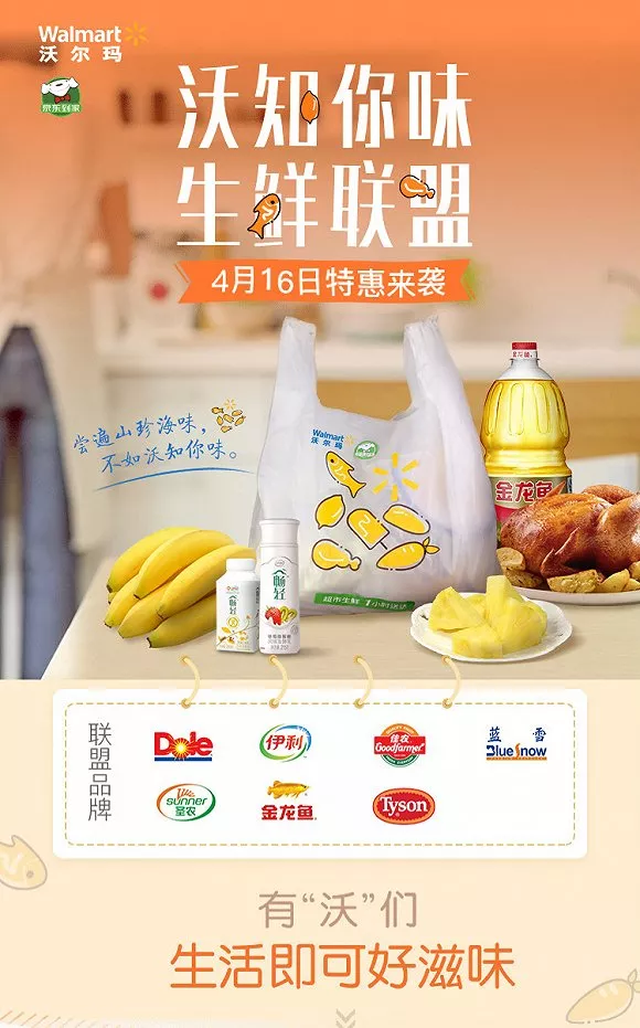 4月16日,沃爾瑪聯合京東到家、泰森、伊利、都樂、圣農、藍雪、佳農、金龍魚等七大生鮮商品供應商,成立了“生鮮聯盟”。沃爾瑪表示,未來會有更多供應商將加入其中。