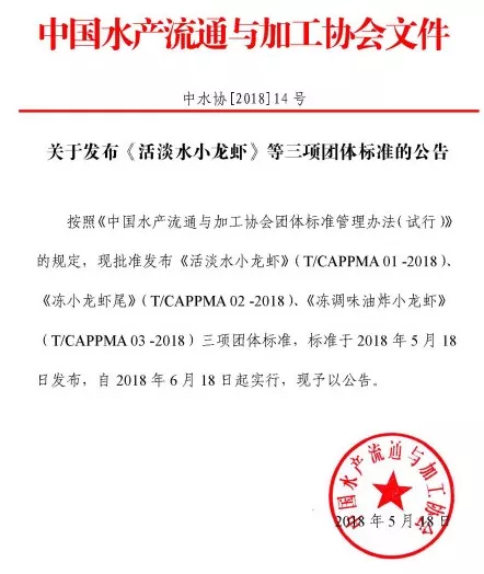 5月18日,經中國水產流通與加工協會批準,由中國小龍蝦協會及協會成員單位共同起草、編制的《活淡水小龍蝦》(T/CAPPMA 01 -2018)、《凍小龍蝦尾》(T/CAPPMA 02 -2018)、《凍調味油炸小龍蝦》(T/CAPPMA 03 -2018)三項團體標準正式發布。