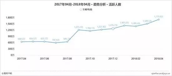易觀數(shù)據(jù)顯示,進(jìn)入四月,天氣回升,各類鮮果開始上市。生鮮電商瞄準(zhǔn)時機(jī),紛紛加強(qiáng)營銷活動的推廣,其移動端應(yīng)用活躍人數(shù)也呈現(xiàn)發(fā)展態(tài)勢。2018年4月,生鮮電商應(yīng)用活躍人數(shù)達(dá)到1715.8萬,活躍用戶環(huán)比增長13.7%。