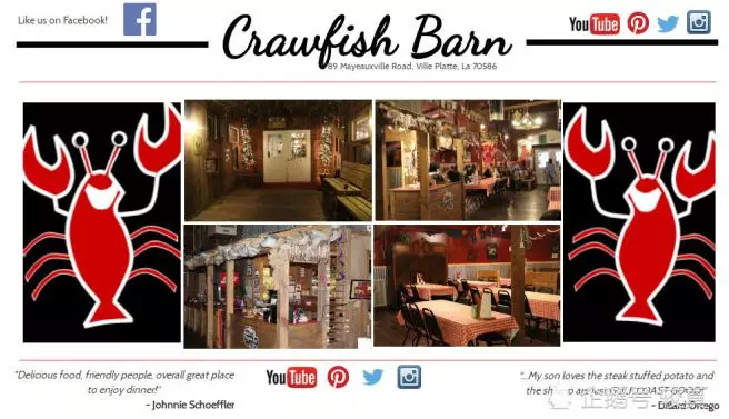 美國(guó)南方的路易斯安娜州人民也是小龍蝦愛(ài)好者,而且絕對(duì)不是網(wǎng)文中說(shuō)的“小龍蝦已經(jīng)從他們的餐桌上逐漸消失”,路易斯安娜不少以小龍蝦作為招牌菜的餐館現(xiàn)在生意都紅火著呢, 像“小龍蝦大倉(cāng)”(Crawfish Barn)這樣的店甚至還有自己的專(zhuān)屬網(wǎng)站,誰(shuí)說(shuō)不吃小龍蝦,餐館老板第一個(gè)拎起炒勺跟他急信不信?