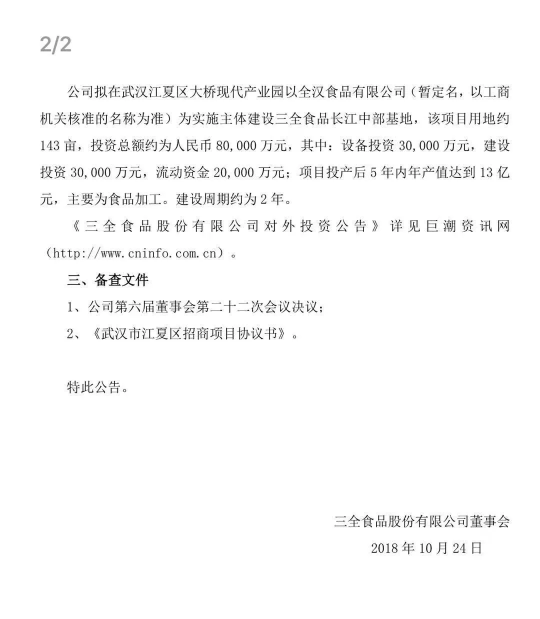 10月17日,安井食品與湯陰縣人民政府簽約,擬投資3億元建華北生產(chǎn)基地。今天,三全食品又發(fā)公告稱(chēng),擬投資8億元在武漢建設(shè)長(zhǎng)江中部基地。