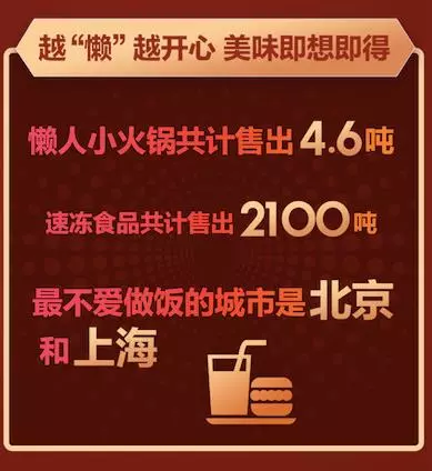 數(shù)據(jù)也證明了“懶人經(jīng)濟(jì)”的真實(shí)存在。11.11期間,京東生鮮懶人小火鍋(自熱火鍋)共計(jì)賣出4.6噸;速凍食品共計(jì)售出2100噸;方便菜銷量是去年同期的1.8倍;火鍋相關(guān)食材售出757噸,夠冰島全民一起吃五次火鍋,其中北京地區(qū)消費(fèi)者買得最多;簡(jiǎn)單加工就能食用的面點(diǎn)銷量是去年同期的2倍;速凍水餃、餛飩的銷量也接近去年同期的2倍。