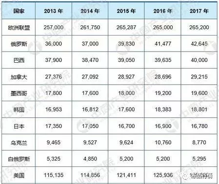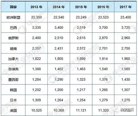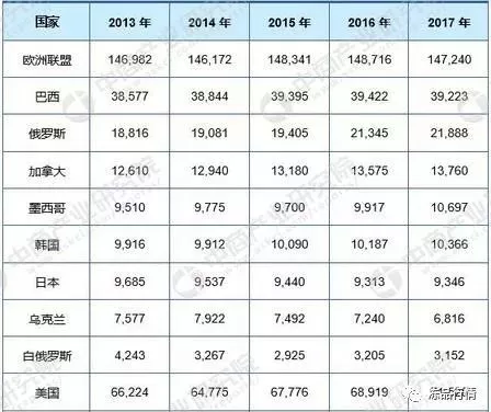 2013-2017年全球豬肉銷量分國(guó)家統(tǒng)計(jì)表(千噸)