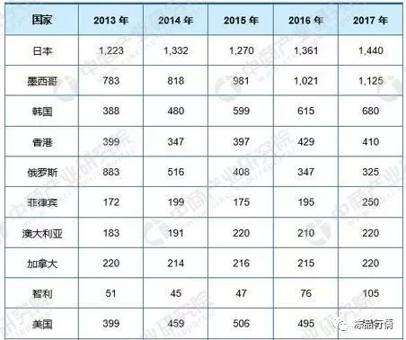 2013-2017年全球豬肉進(jìn)口量分國(guó)家統(tǒng)計(jì)表(千噸)