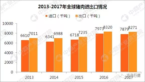 根據(jù)數(shù)據(jù)統(tǒng)計(jì),2017年全球豬肉進(jìn)口量為787.9萬(wàn)噸,比2016年稍微下滑。出口量為827.1萬(wàn)噸。