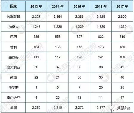 2013-2017年全球豬肉出口量分國(guó)家統(tǒng)計(jì)表(千噸)