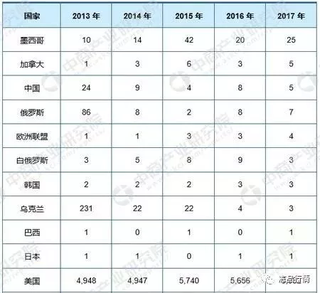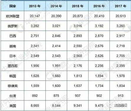 2013-2017年全球生豬出欄量分國(guó)家統(tǒng)計(jì)(千頭)