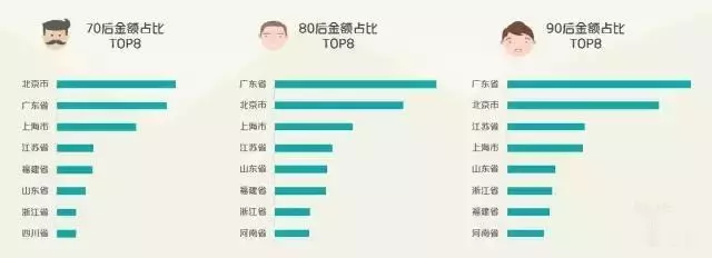 廣東、北京、上海消費貢獻分列全國前三;北京70后的消費貢獻為全國同齡消費規模冠軍;廣東80、90后位列全國同齡規模冠軍。