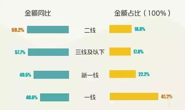 2017年二三四線城市增速達59%,增幅顯著高于一線及新一線,且增速優勢不斷擴大;一線城市作為老大哥的地位仍然堅挺,消費規模占全國41%;新一線占22%;二線與三線均在18%左右。