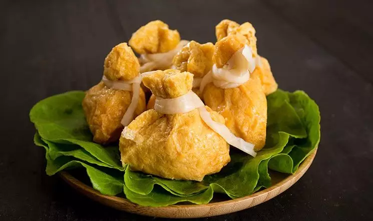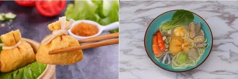 金黃色的小袋子裝得鼓鼓囊囊,有的還會印上“吉”“祥”“如”“意”“福”等字樣。袋口被綁著,里面裝了啥誰也不知道,一口咬下去,鮮美的滋味瞬間給人帶來巨大驚喜。它的功能性也非常強,可用于火鍋、關東煮、麻辣燙、高端餐廳配菜等。