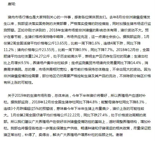 “2018年生豬市場(chǎng)受非洲豬瘟的影響總體有限,豬價(jià)波動(dòng)不大。預(yù)計(jì)在春節(jié)前,生豬價(jià)格將保持穩(wěn)中略降,市場(chǎng)供應(yīng)充足。”