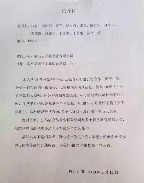 張雷介紹,他三年前開始為駐馬店眾品供應生豬,目前一共被拖欠了14萬余元的貨款。從去年6月到現在,他等了整整一年,還是沒拿到一分錢,不得已走上了維權道路。