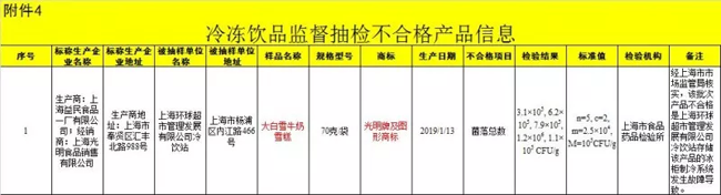 7月15日,國(guó)家市場(chǎng)監(jiān)管總局發(fā)布《關(guān)于8批次食品不合格情況的通告》。通告顯示,一批次標(biāo)稱上海光明食品銷售有限公司經(jīng)銷的、上海益民食品一廠有限公司生產(chǎn)的光明牌大白雪牛奶雪糕,菌落總數(shù)超標(biāo)。