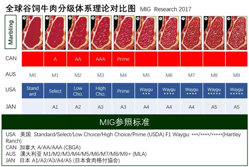 最后,由于分級體系的不同,我們一起橫向梳理一下全球谷飼牛肉分級體系的對應(yīng)關(guān)系: