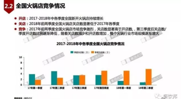 全國火鍋店數量在2017年穩定維持在30萬左右,二、三季度略低于一四季度;2018年前兩季度全國火鍋店數量持續增長,2018年第二節度達到近40萬。值得欣喜的是,全國新開火鍋店持續增長,2018年關店數顯著低于2017年各季度。隨著關店數減少和開店數增加,整個火鍋行業市場規模逐漸增大,全國火鍋市場競爭激烈。