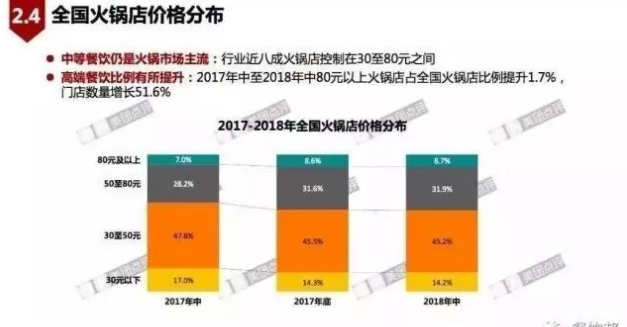 從2017年到2018年整體來看,30-50元、50-80元的火鍋店價格,為火鍋市場主流。從數據可見,2017年中至2018年中80元火鍋店占全國火鍋店比例提升1.7%。隨著消費升級,火鍋的高端餐飲比例有所提升。