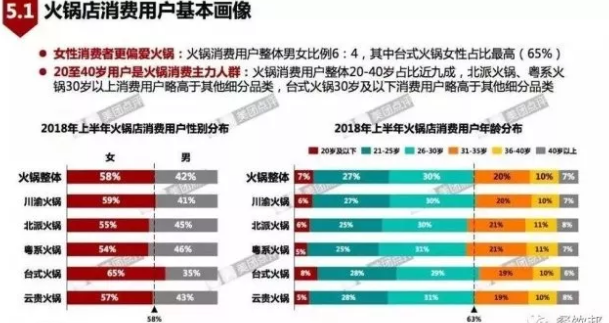 從2018年上半年火鍋店消費用戶性別分布來看,火鍋整體的消費女性占58%,男性占42%。20-40歲的用戶占火鍋消費用戶整體的近九成。