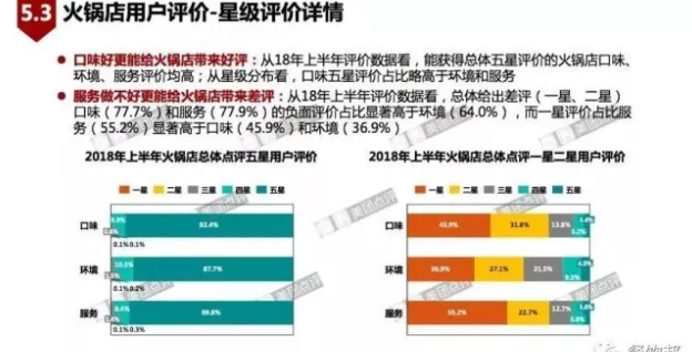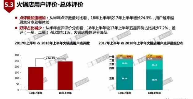 從大眾點評的數據看到,越來越多的火鍋用戶愿意分享就餐體驗。但火鍋店的整體評分降低,18年上半年較17年上半年五星評價占比減少7.2%,差評占比增加。