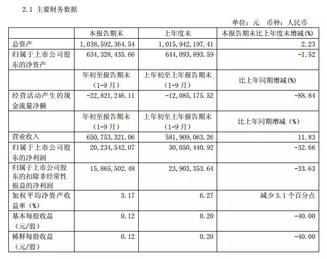 公告顯示,公司前三季度實現(xiàn)營業(yè)收入 6.51億元,較上年度同期5.82億增長11.83%;實現(xiàn)凈利潤2,023萬元,較上年度同期3,005萬元下降 32.66%。