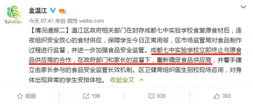 事件發生后,昨天,成都溫江人民政府@金溫江 通報,已對食品原料封存并送檢,立即終止與原食品供應商合作,對相關責任人進行調查。