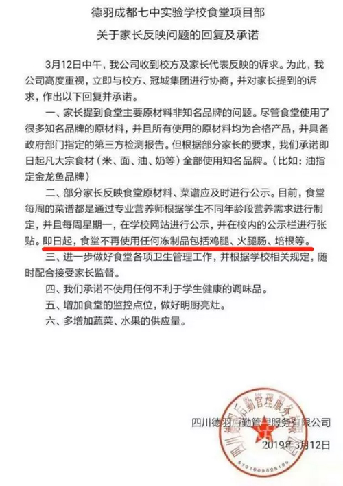 昨天,德羽后勤表示,學校使用的所有材料均為合格產品,并有政府部門指定的第三方檢測報告;公司從即日起將停止使用任何凍制品,并在學校網站內進行公示;對于學生家長反映的調味品問題,公司也承諾“不使用任何不利于學生健康的調味品”。