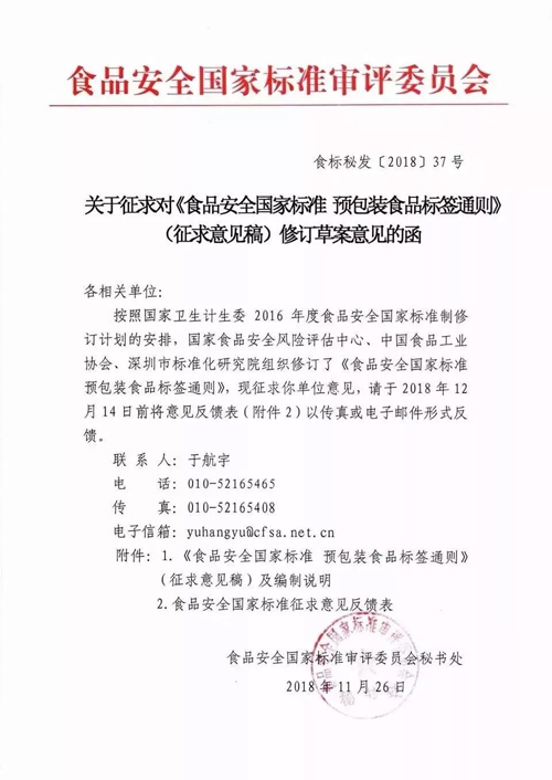 2018年底,食品安全國家標(biāo)準(zhǔn)審評委員會對外發(fā)布的關(guān)于征求對《食品安全國家標(biāo)準(zhǔn) 預(yù)包裝食品標(biāo)簽通則》(征求意見稿)修訂草案意見的函。