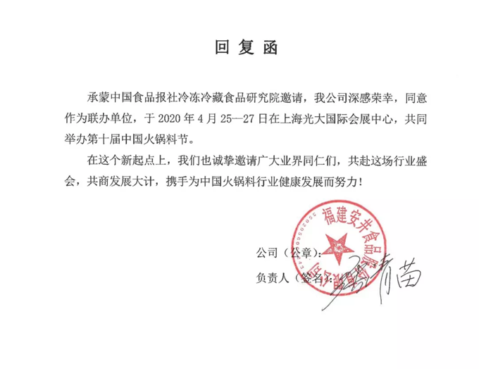 應(yīng)中國食品報社冷凍冷藏食品研究院/第十屆中國火鍋料節(jié)組委會邀請,安井、三全快廚、海欣、惠發(fā)、海霸王、千味央廚、升隆、鴻津、佳士博、源香、福春園等組成“最強(qiáng)陣營”,成為2020年第十屆中國火鍋料節(jié)聯(lián)合承辦單位。