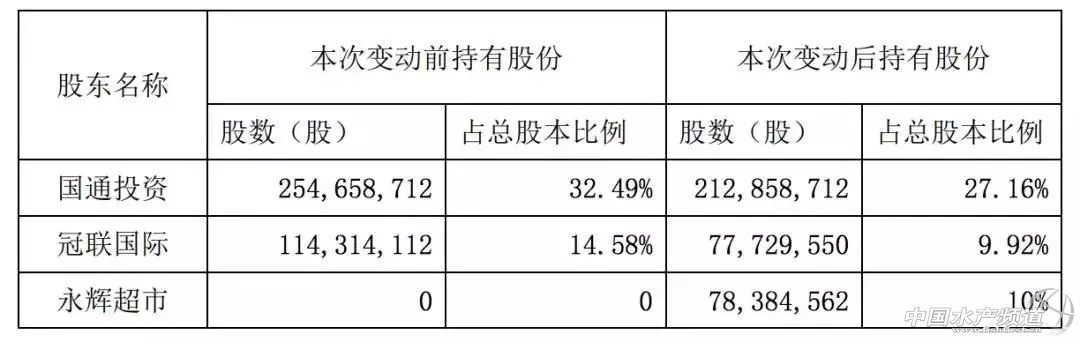 公告稱,國聯(lián)水產(chǎn)于 2018 年 3 月 23 日收到公司控制股東新余國通投資管理有限公司(以下簡稱“國 通投資”)、主要股東冠聯(lián)國際投資有限公司(以下簡稱“冠聯(lián)國際”)和永輝超市股份有限公司(以下簡稱“永輝超市”)簽署了《關(guān)于湛江國聯(lián)水產(chǎn)開發(fā)股 份有限公司之股份購買協(xié)議》的通知,國通投資和冠聯(lián)國際以協(xié)議轉(zhuǎn)讓的方式分別向永輝超市轉(zhuǎn)讓其持有的公司股份 41,800,000 股和 36,584,562 股,分別占公司股份總數(shù)的 5.33%和 4.67%,兩者合計轉(zhuǎn)讓公司股份 78,384,562 股,占公司股份總數(shù)的10%。