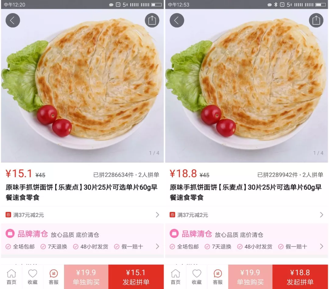 而看看前文提到的手抓餅,真的是很便宜。拿其他品牌的產(chǎn)品相比,在天貓上同樣是25片一桶的產(chǎn)品,思念42.9元、三全綠標(biāo)48.8元、安井33.5元。相比之下,拼多多上最低15.1元的價格低得不是一點點。